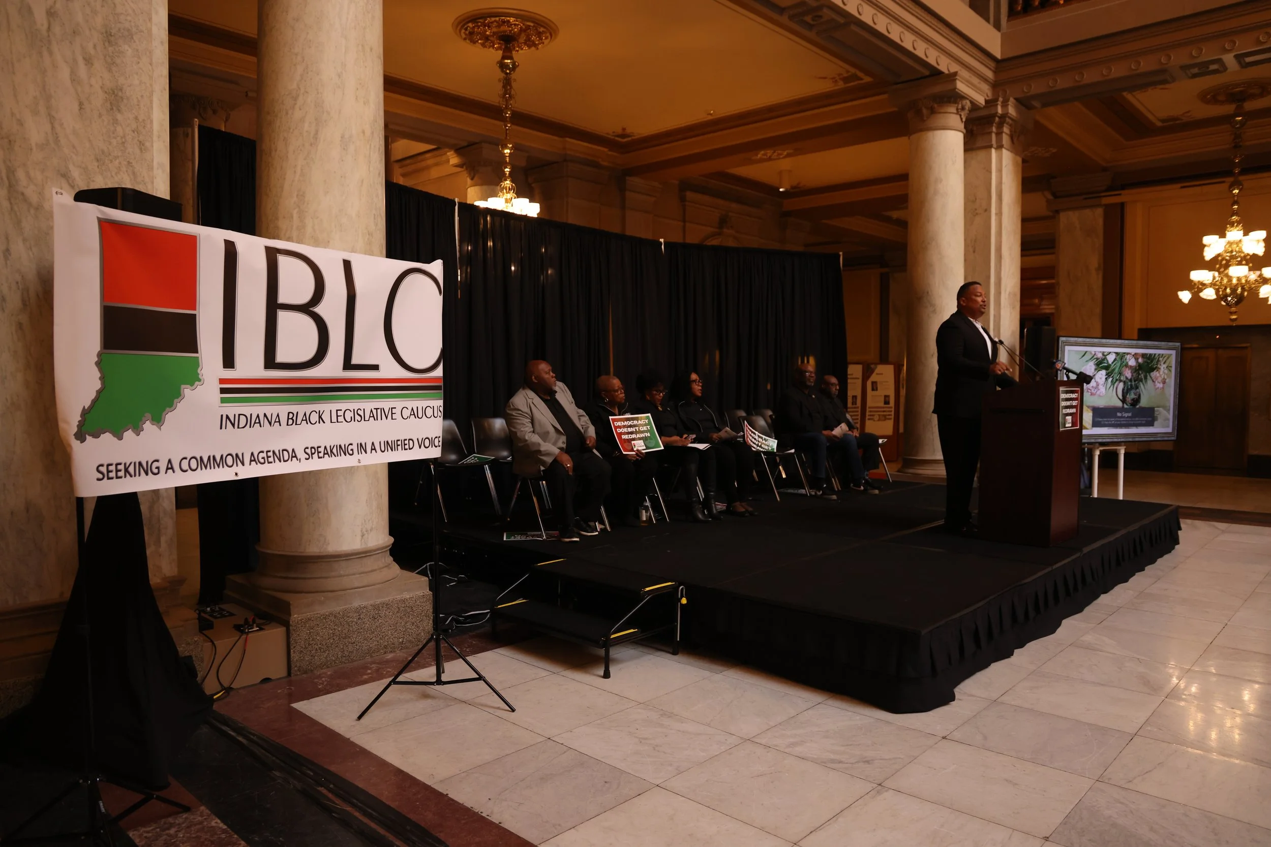 The event, organized by the Indiana Black Legislative Caucus, featured remarks from lawmakers and activists who voiced opposition to proposed redistricting championed by some Republicans, whose party currently holds a supermajority in both the Indiana House of Representatives and the Indiana Senate.